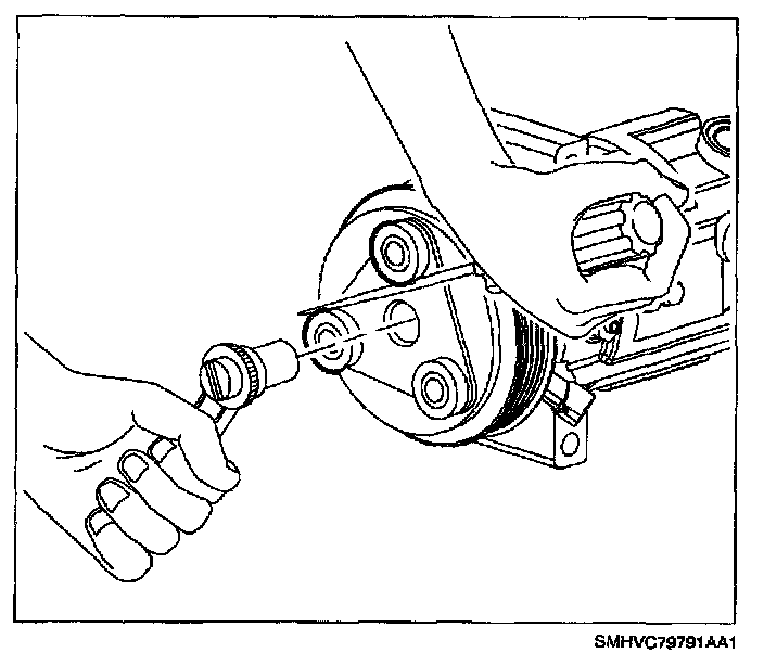 4. Hand tighten nut on installation bolt to align pulley to A/C compressor. While holding end of bolt, tighten nut until pulley bottoms out on A/C compressor.