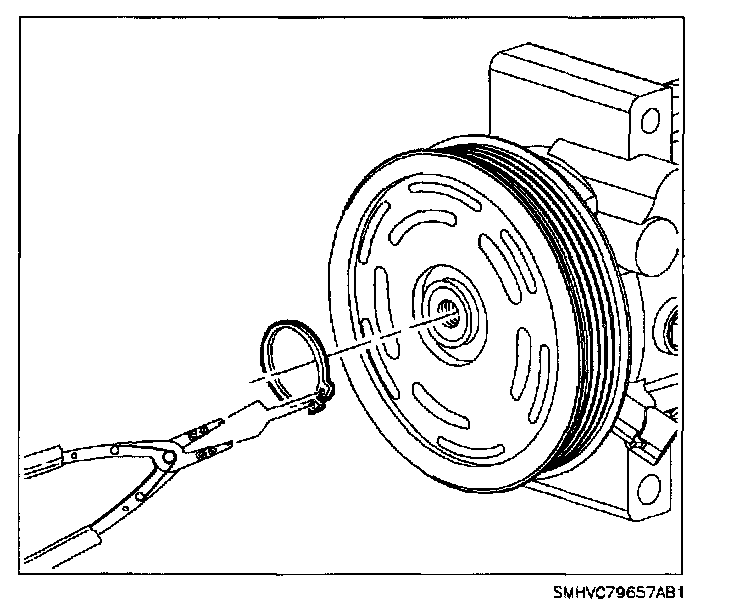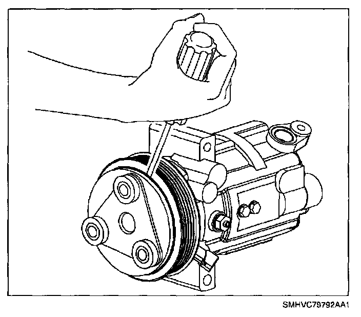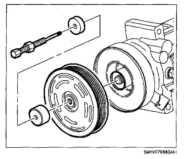 NOTE: Do not remove pulley without puller adapter. If A/C compressor shaft is pressed on, A/C compressor will be damaged.