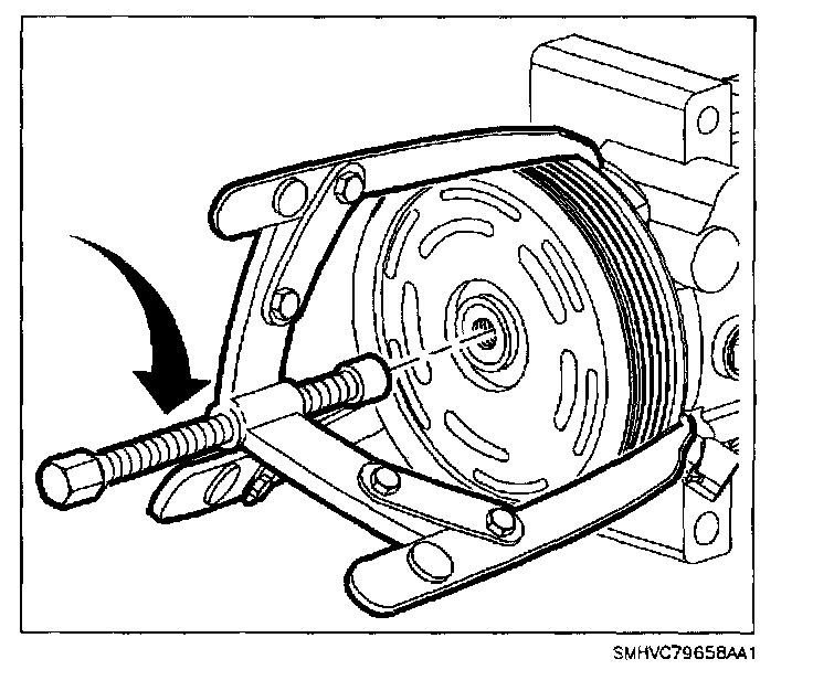 6. Install three-jaw puller on A/C compressor pulley. Tighten center bolt to remove pulley assembly.