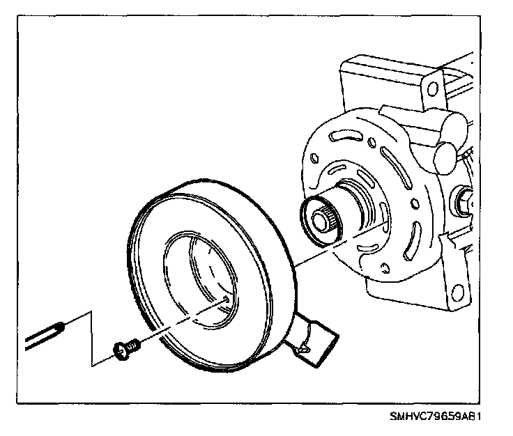 7. Remove A/C compressor clutch coil screws and remove A/C compressor clutch coil.