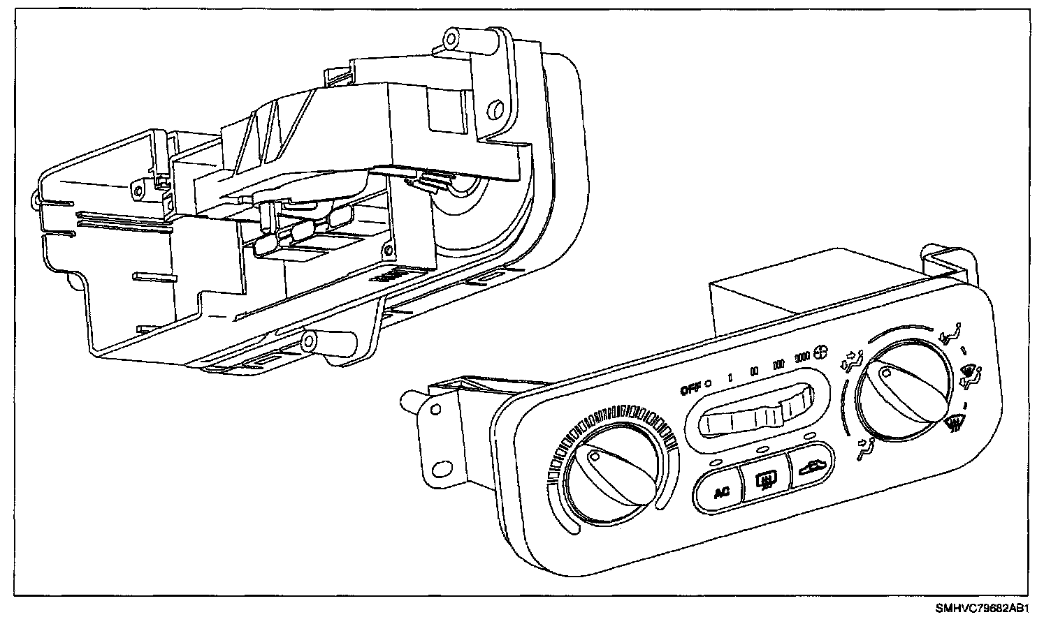 The temperature knob controls the temperature door through a cable from the HVAC control assembly to the HVAC module. The mode knob controls the various mode positions using an actuator located on the HVAC module.