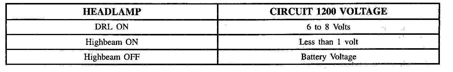 For DRL operation, the parking brake must be fully released, the ignition switch must be in the RUN position and headlamp switch must be in the Off position. Under normal operating conditions, the feedback voltage to the BCM measured at circuit 1200 is:
