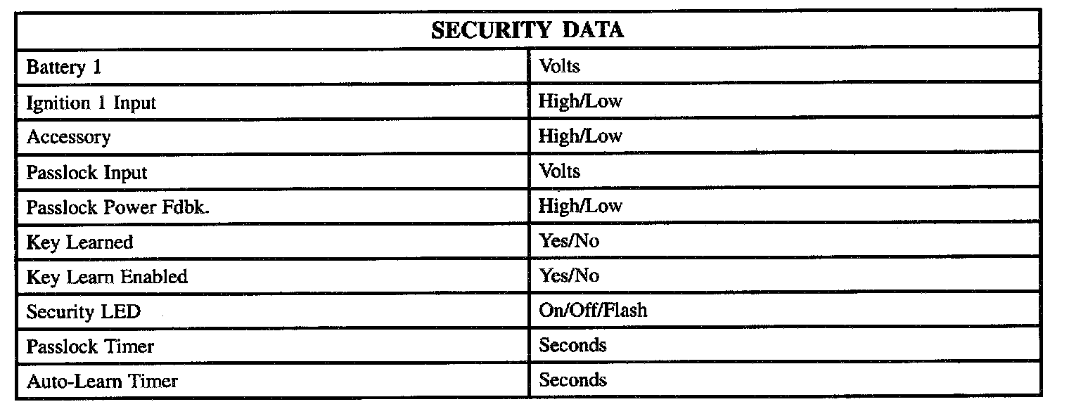 The table lists the security data directly connected to the Body Control Module (BCM) related to the Passlock System only: