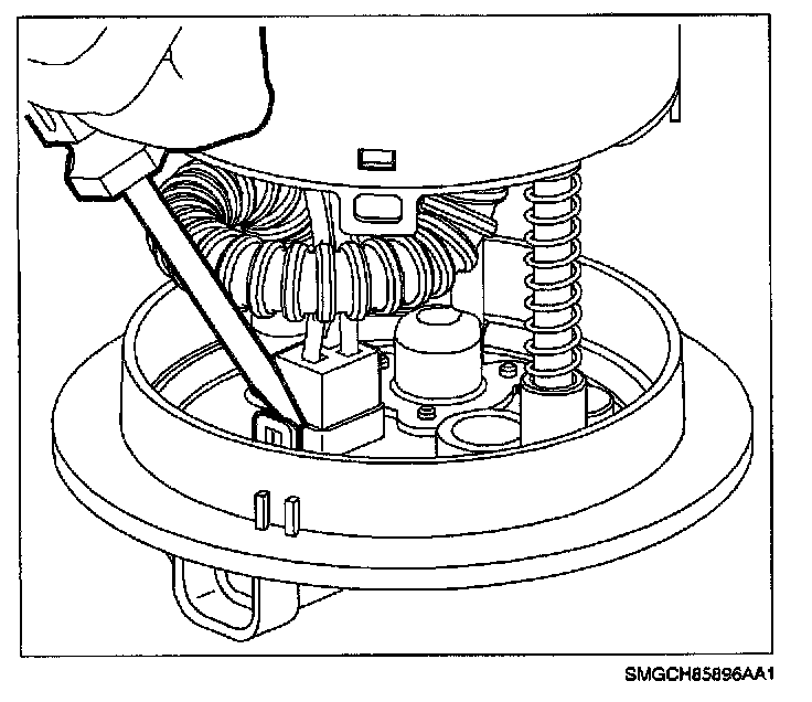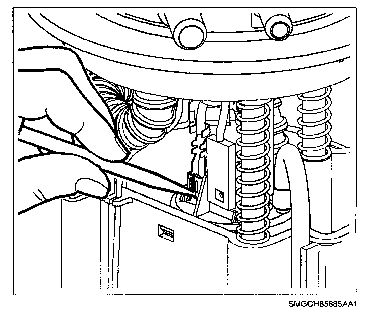 7. Remove connector housing from bottom side of fuel pump cover. (Disengage locking tab with fingernail or small flat blade screwdriver.)