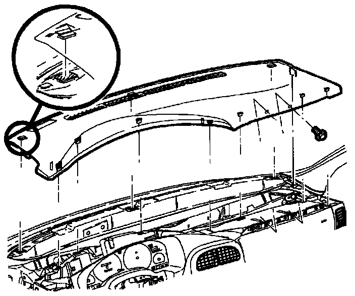 6.3 Align tabs on sides of upper trim panel with openings in windshield garnish molding.