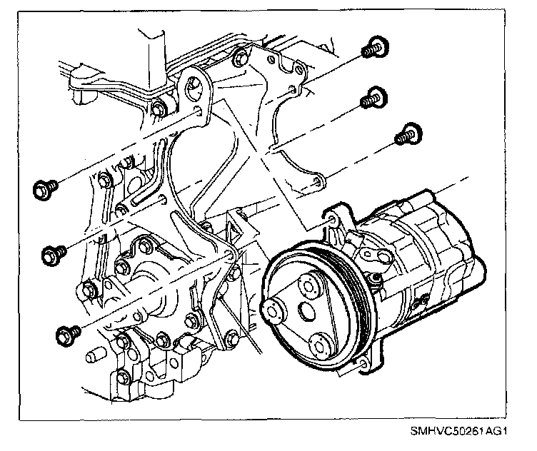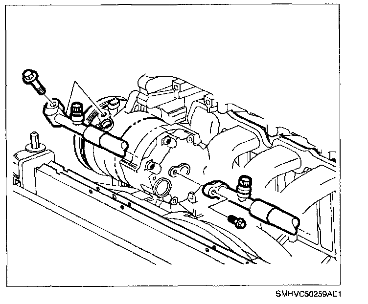 REMOVALNOTE: When servicing the compressor, keep dirt and foreign material from getting on or into the compressor parts and system. Clean tools and clean work area are important for proper service. The compressor connections and the outside of the compressor should be cleaned before any on car repairs, or before removal of the compressor. The parts must be kept clean at all times and any parts to be assembled should be cleaned with a non-petroleum based solvent and dried with air. Use only lint free cloths to wipe parts. Do not allow solvent to enter compressor or hoses.