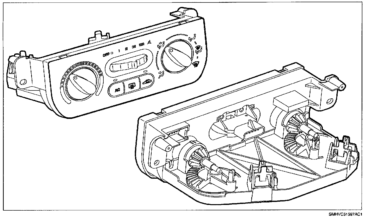 The operation of the A/C system is controlled by the buttons, rotary switch, and knobs on the HVAC control. The compressor clutch and recirc motor are controlled electrically by push buttons on the control head.