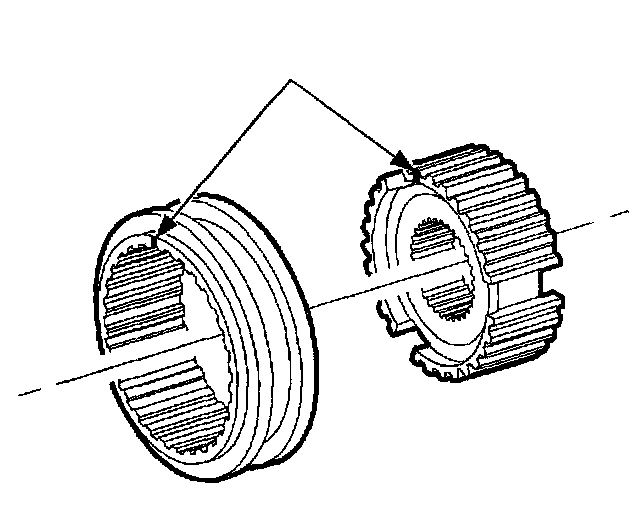 IMPORTANT: Synchronizer hub and sleeve must be kept together as matched set. Note spline alignment marks on hub and sleeve (indicated by the arrows).1. Use press to disassemble input shaft. Place support under 3rd drive gear.