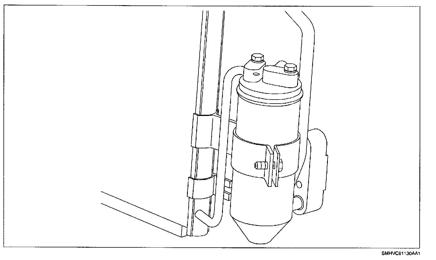 The Receiver/Dehydrator (R/D) is located to the left of the condenser and is mounted in a bracket which is welded to the condenser. Its purpose is to act as a reservoir for liquid R134a refrigerant received from the condenser. A constant flow of liquid refrigerant must be supplied to the TXV to allow it to regulate properly. The R/D assembly also contains a desiccant bag which absorbs any moisture that may have entered the system The RID assembly should be replaced any time it has been open to the atmosphere for an extended period of time as the desiccant will become saturated.