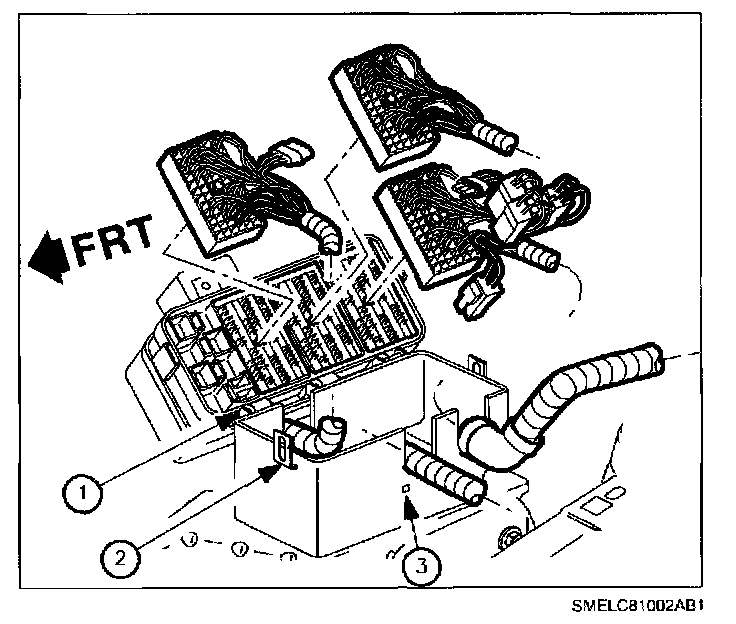10. Push in tabs (3) on the end of the fuse block case and roll back the fuse block (1).