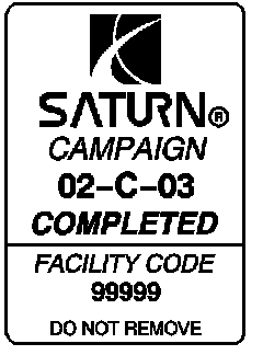 Upon completion of the campaign, a Campaign Identification label and a Clear Protective Cover should be affixed on a clean, dry surface of the radiator core support in an area clearly visible when the hood is raised. Each label provides a space to print in ink (or type) the campaign number (02C03) and the five (5) digit facility code of the Retailer performing the campaign service.