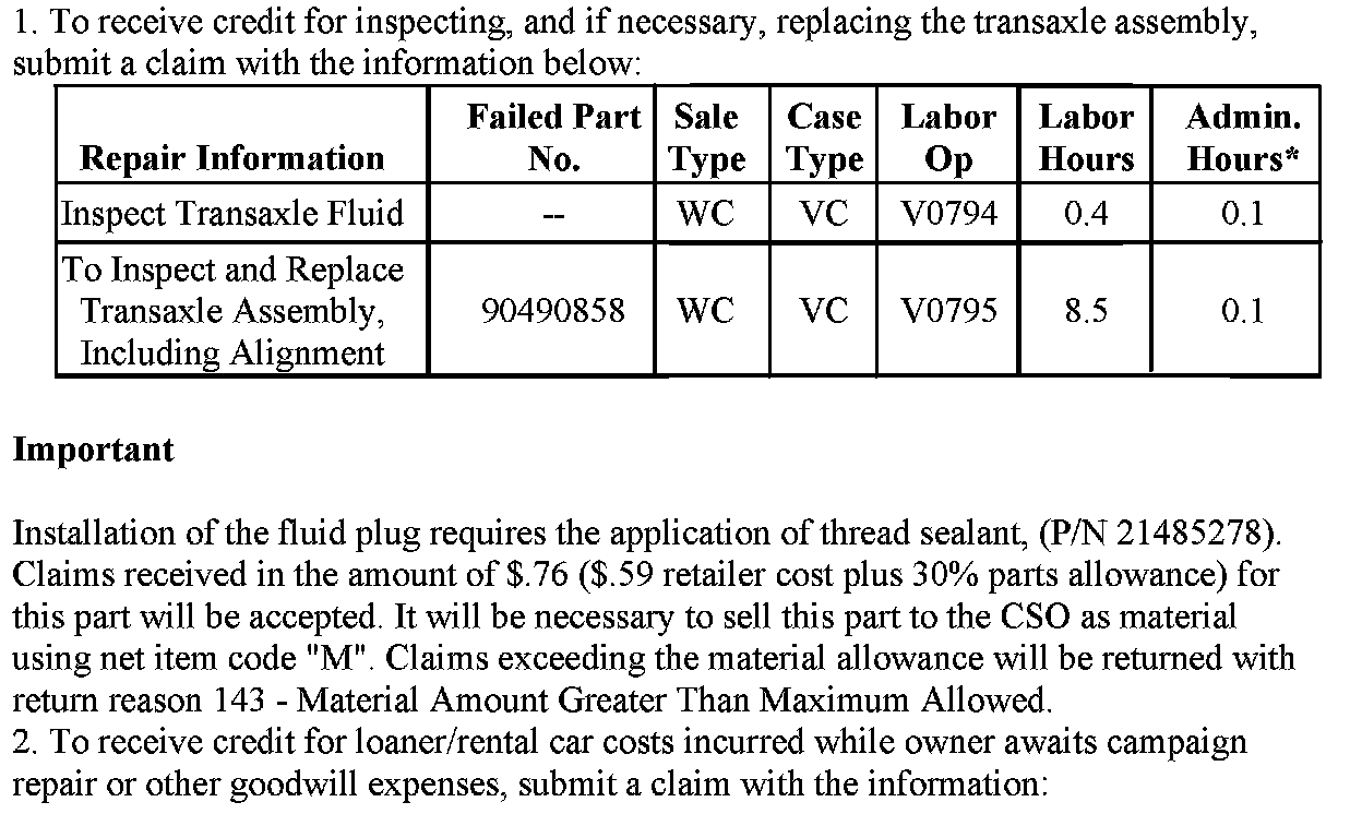 To prevent the possibility of this damage occurring, Saturn Retailers will inspect the fluid level and replace the transaxle assembly, if necessary.