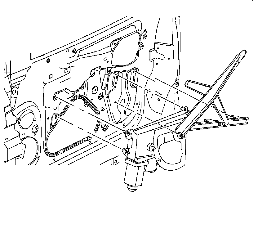 1. Install the front door regulator through the opening in the lower center door reinforcement.