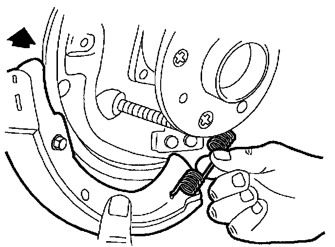 4. Attach lower retaining spring and install leading (front) brake shoe, hold down pin, and retaining spring.