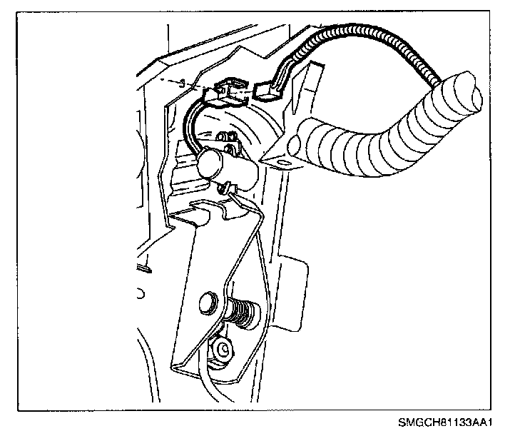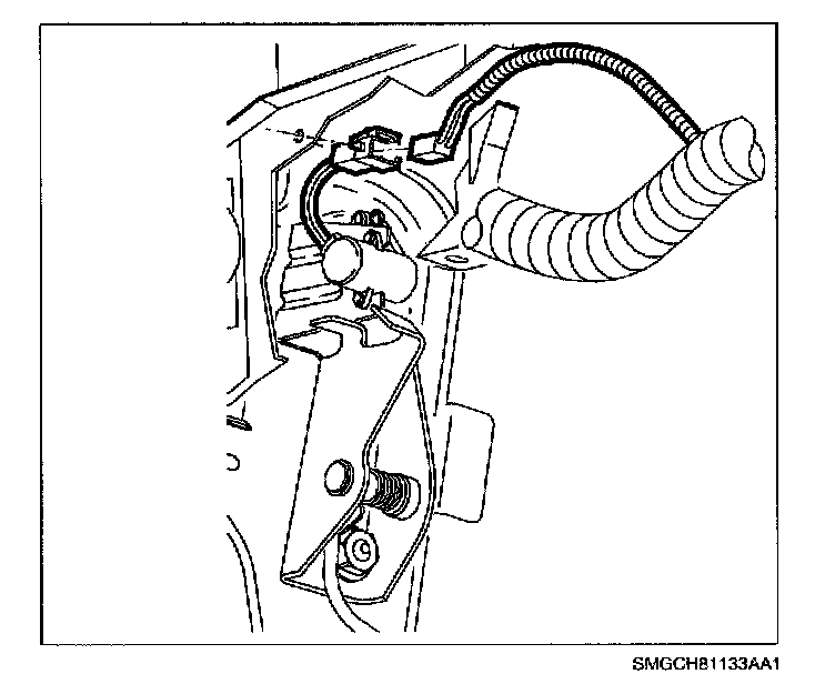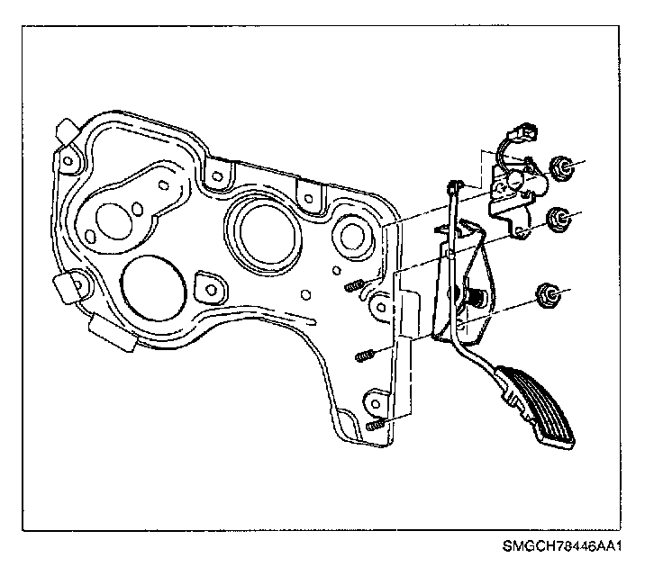 4. Depress accelerator pedal and install upper pedal bracket to front of dash attachment nut.