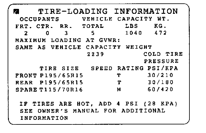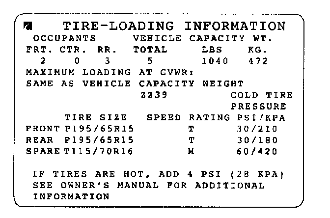 For tire pressure and maximum tire load rating specification values, refer to tire loading information sticker located on rear edge of driver's side rear door.