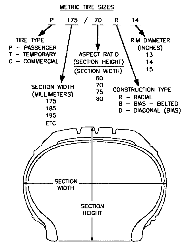 All models are equipped with metric sized steel belted radial tires. The metric tire size format is shown in the illustration. When replacement is necessary, the original equipment type tire should be used.