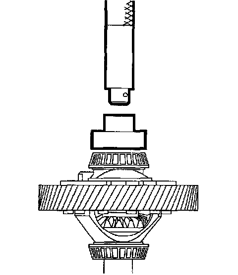 1. Press differential bearings onto differential assembly using Differential Bearing Installer SA9120T and Ball Detent Handle SA9172G. Use bearing support 87-92-210 under the differential as shown.