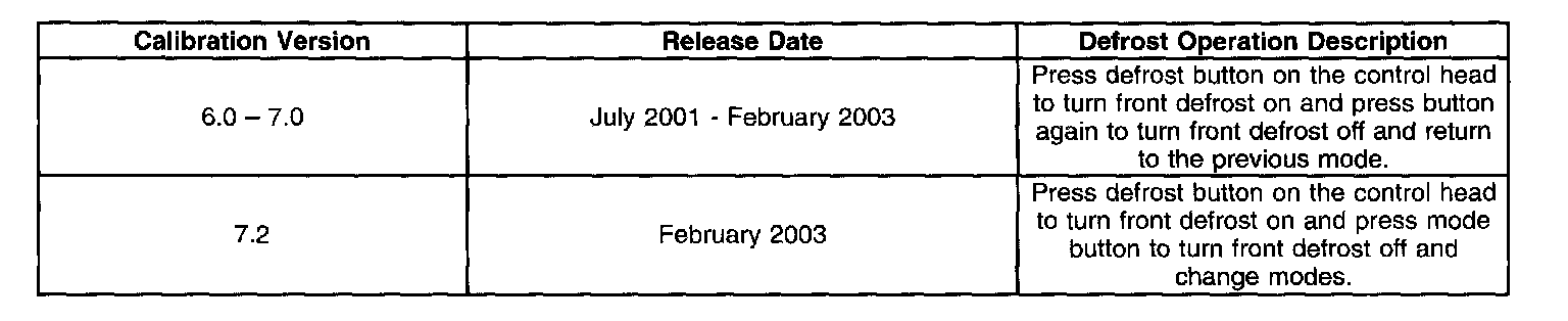 The purpose ot this bulletin is to provide intormation on the detrost operation change with the latest automatic HVAC calibration installed. When installing the 7.2 version of the automatic HVAC calibration into a vehicle that previously had the 6.0 or 7.0 version of the calibration installed, the operation of the front detrost button will change. The table describes the operation of the front defrost button with each calibration version.