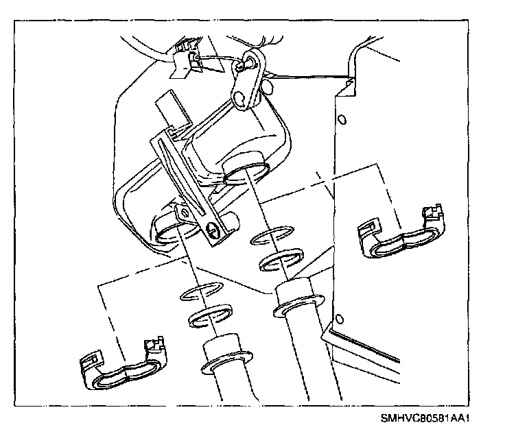 IMPORTANT: Lower heater pipe clamp hinge fits into the tab of the heater core retainer strap.