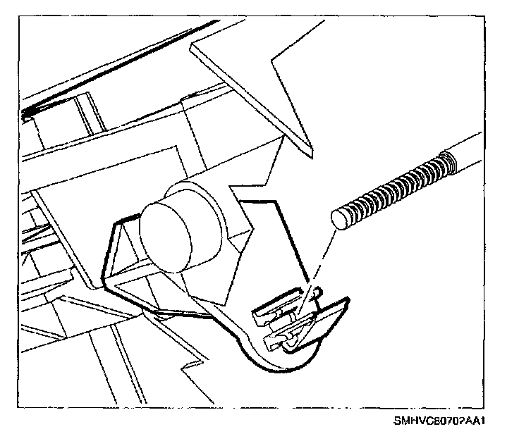 25. Install temperature door cable eyelet over temperature door lever. Do not install housing into retaining clip at this time.