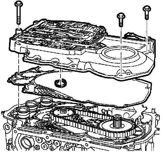 4. Install channel plate assembly onto transaxle case. The channel plate should fit tightly over guide pins located on transaxle case.