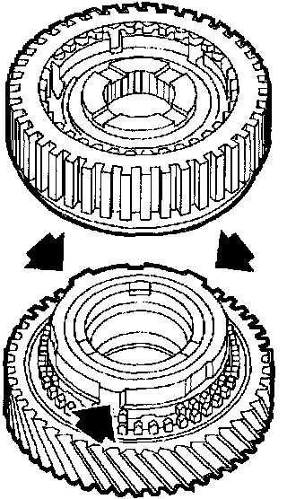 IMPORTANT: The recesses in the 1st/2nd synchronizer sleeve must align with the narrow gaps in the synchronizer hub.