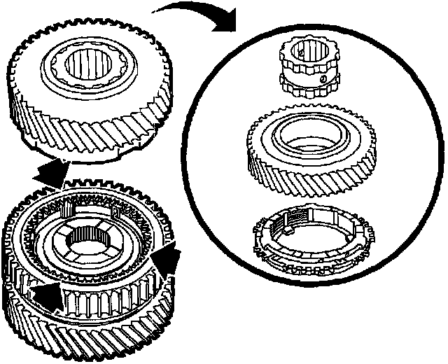 6. Install 1st/2nd synchronizer hub and sleeve onto 1st driven gear and blocking ring (fork groove on sleeve [faces 1st gear). Align gaps in synchronizer hub with blocking ring lugs.