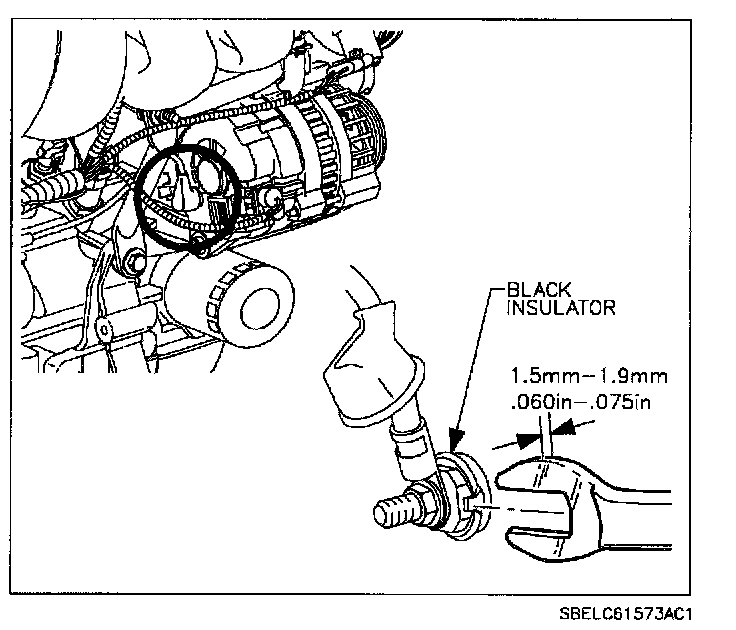 2. Install the generator regulator connector and install the fusible link to the generator. When installing the fusible link, use the Generator Output Stud Wrench (SA9401C) to prevent the output (B+) stud from rotating.