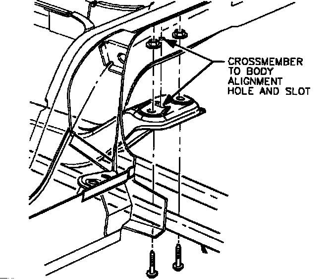 1. Install crossmember onto vehicle while carefully sliding rear brake line into crossmember. Align crossmember to body using a 3/8 inch rod at alignment hole and slot.