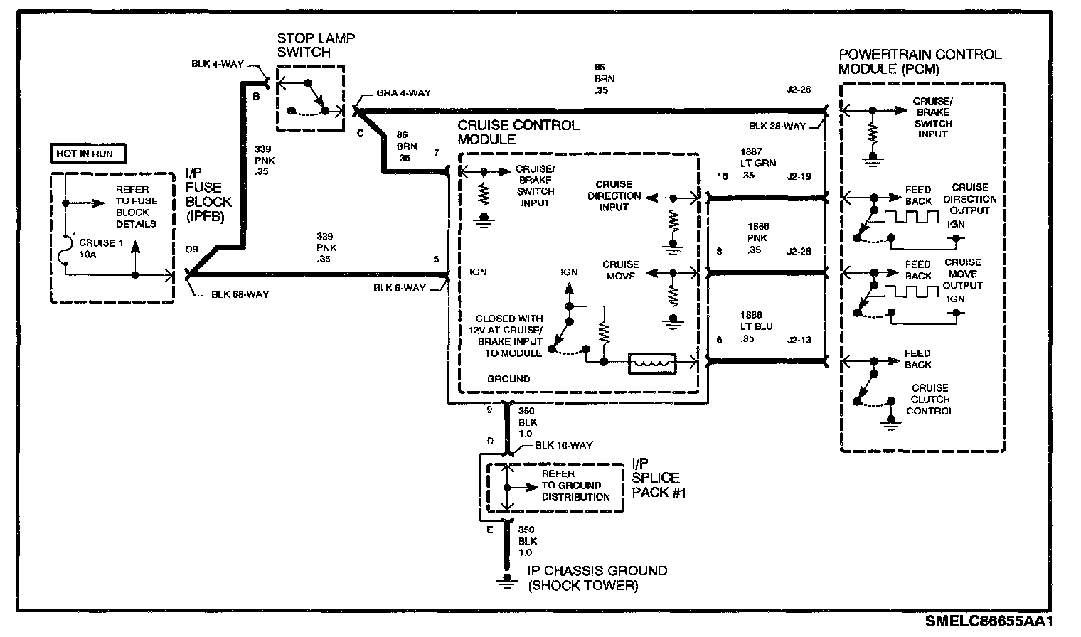 The cruise control module uses the ignition voltage from the cruise/brake input to control the cruise control clutch high side driver. If this voltage is not present, ignition voltage to the cruise clutch will be lost.