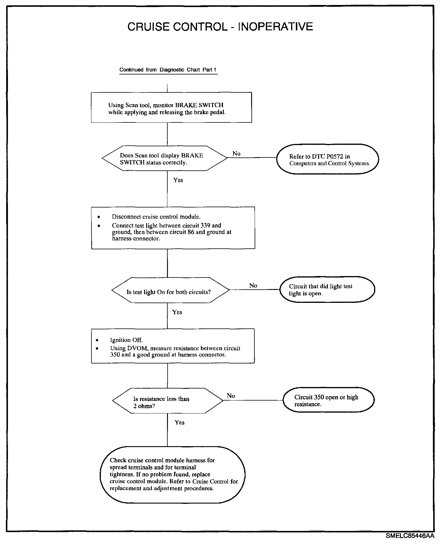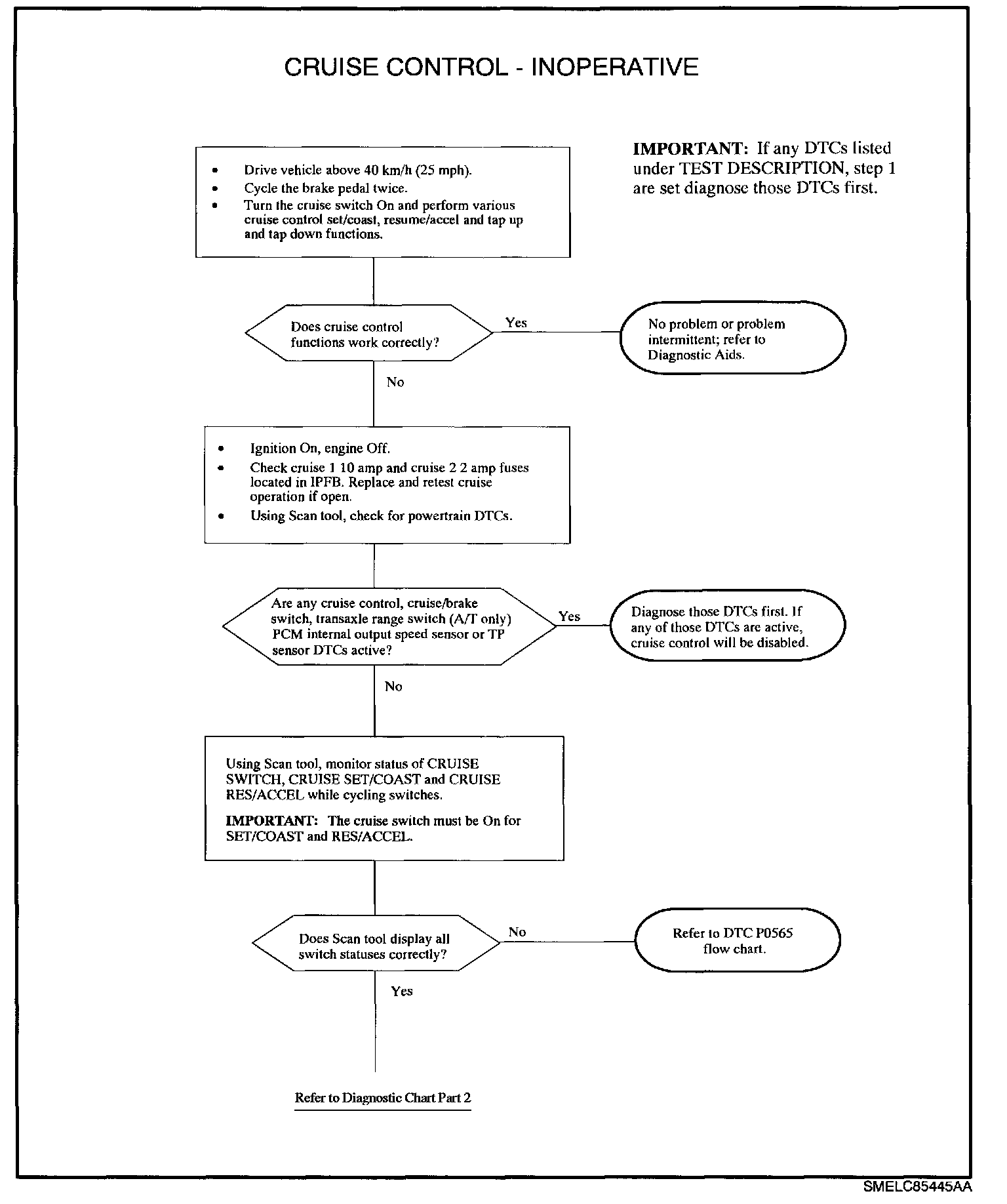 1. Check for any cruise control, cruise/brake, transaxle range switch, PCM internal fault, output speed sensor or TP sensor DTCs. Diagnose those first as they are probably the cause of an inoperative cruise control system.