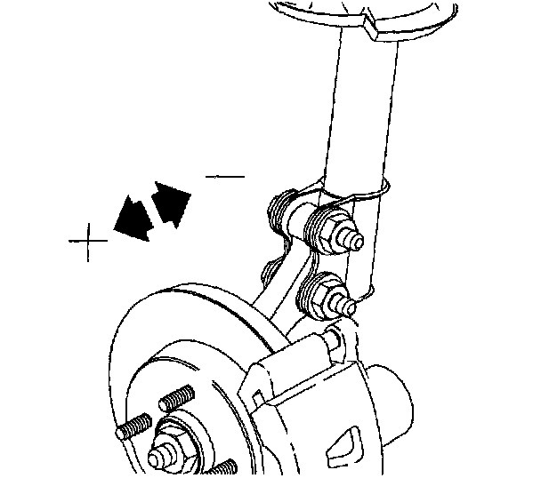2. Loosen two strut-to- knuckle fasteners and pull or push knuckle in direction of desired change. This will allow up to 1.5 degrees of adjustment.