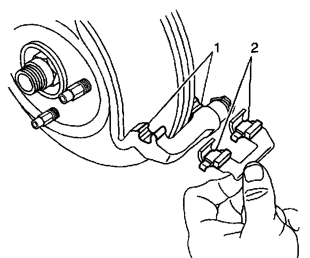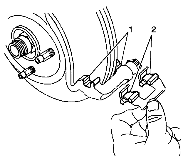 3. Remove the disc brake pad retainers (2) from the brake caliper bracket.