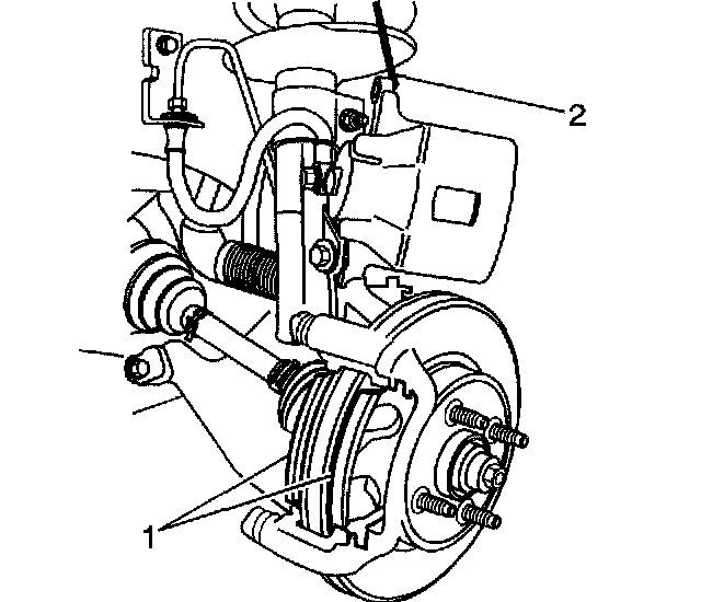 1. Remove the brake caliper from the brake caliper mounting bracket and support the brake caliper with heavy mechanic's wire (2), or equivalent. Do NOT disconnect the hydraulic brake flexible hose from the caliper.