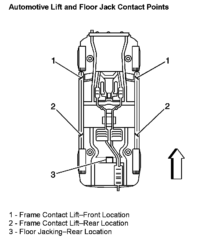 - Perform the vehicle lifting or jacking procedure only at the identified lift points. DO NOT allow the lifting equipment or jacking equipment to contact any other vehicle components.