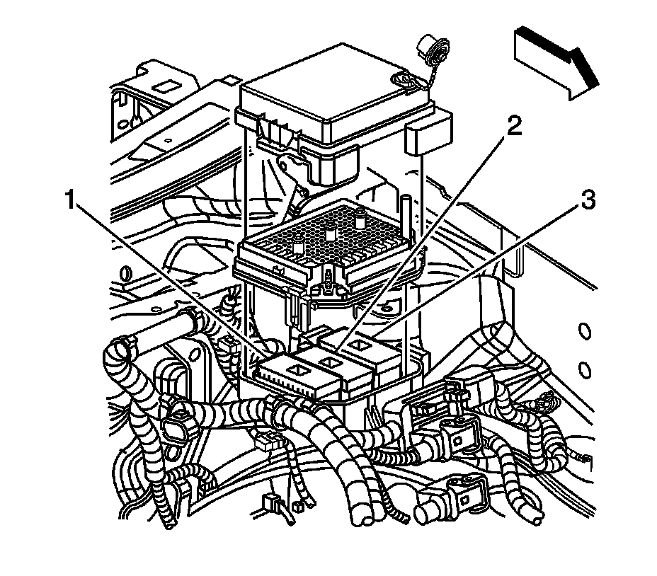 9. Remove the engine wiring harness connector (1), the body wiring harness connector (2), and the forward lamp harness connector (3) from the base of the junction block and the junction block base.