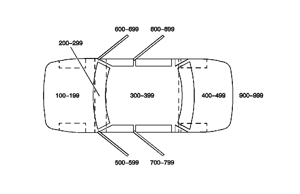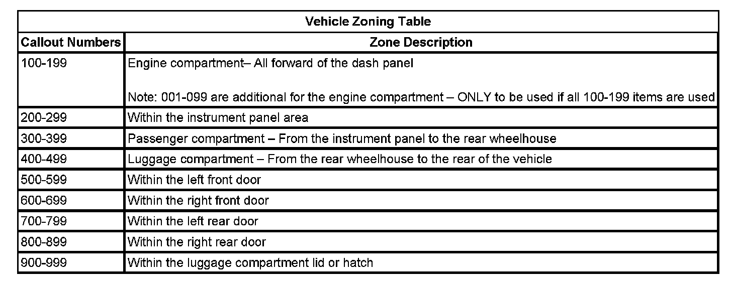 All grounds, in-line connectors, pass-through grommets, and splices have identifying numbers that correspond to where they are located in the vehicle. The table explains the numbering system.