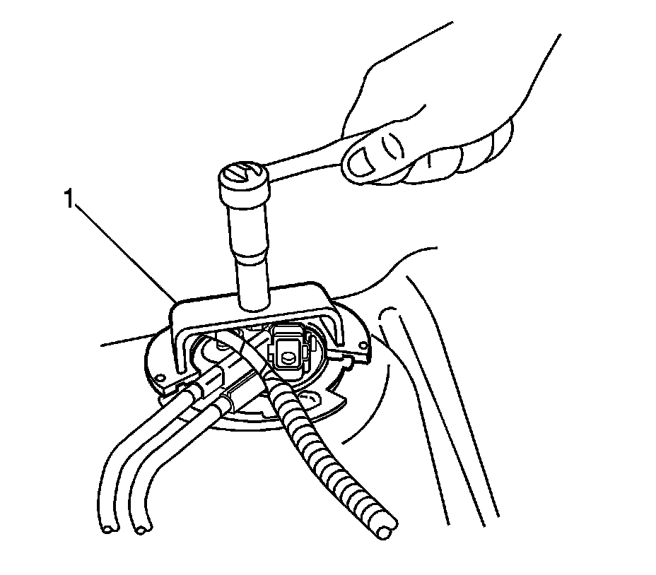5. Using the SA9156E , or J 39765 (1), carefully rotate to release the fuel pump module retaining lock ring.