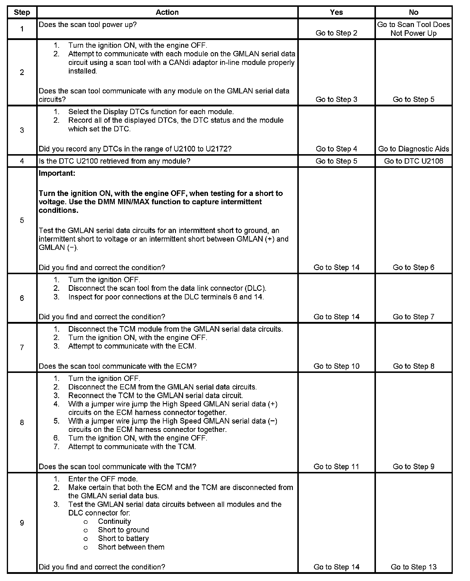 Modules connected to the GMLAN serial data circuit monitor for serial data communications on the GMLAN network during normal vehicle operation. Operating information and commands are exchanged among the modules. When a module detects a bus-off condition a DTC U2100 will be set. This DTC can be retrieved as history only.