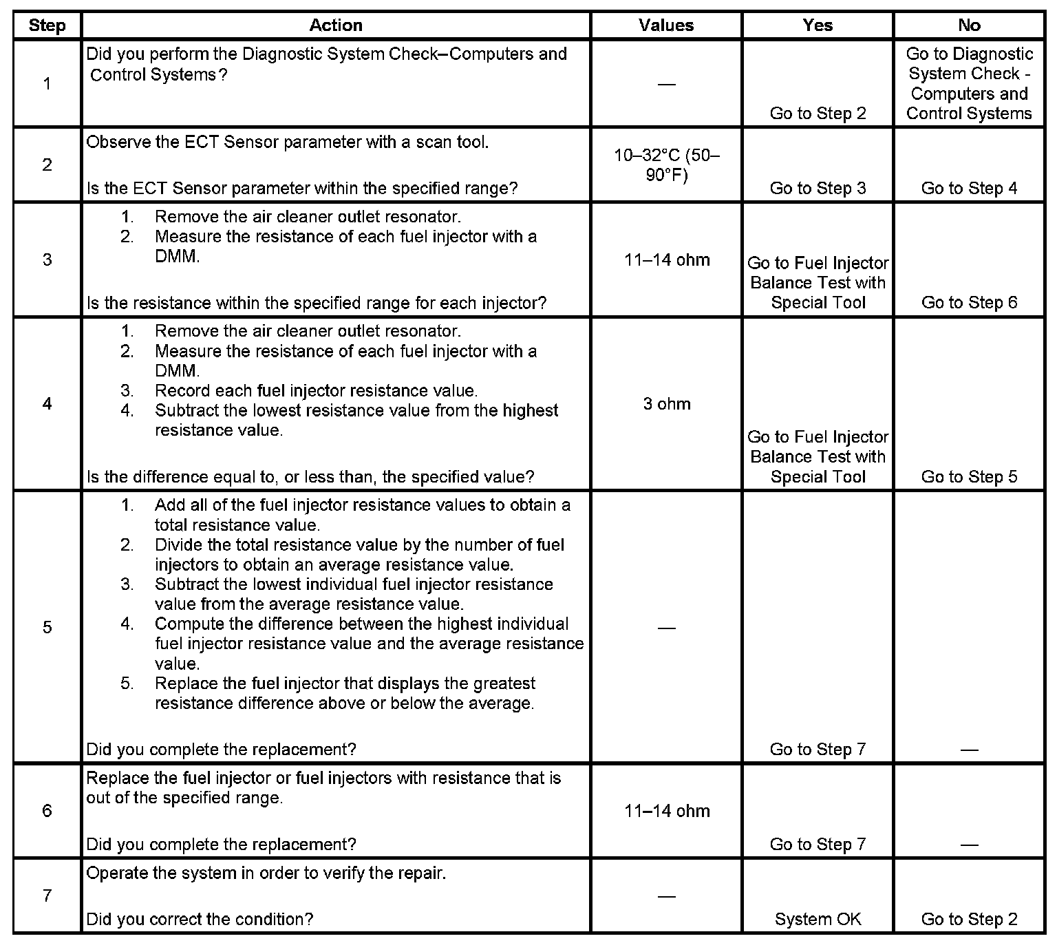 - Perform the fuel injector coil test within the conditions of the customer's concern. A fuel injector condition may only be apparent at a certain temperature, or under certain conditions.