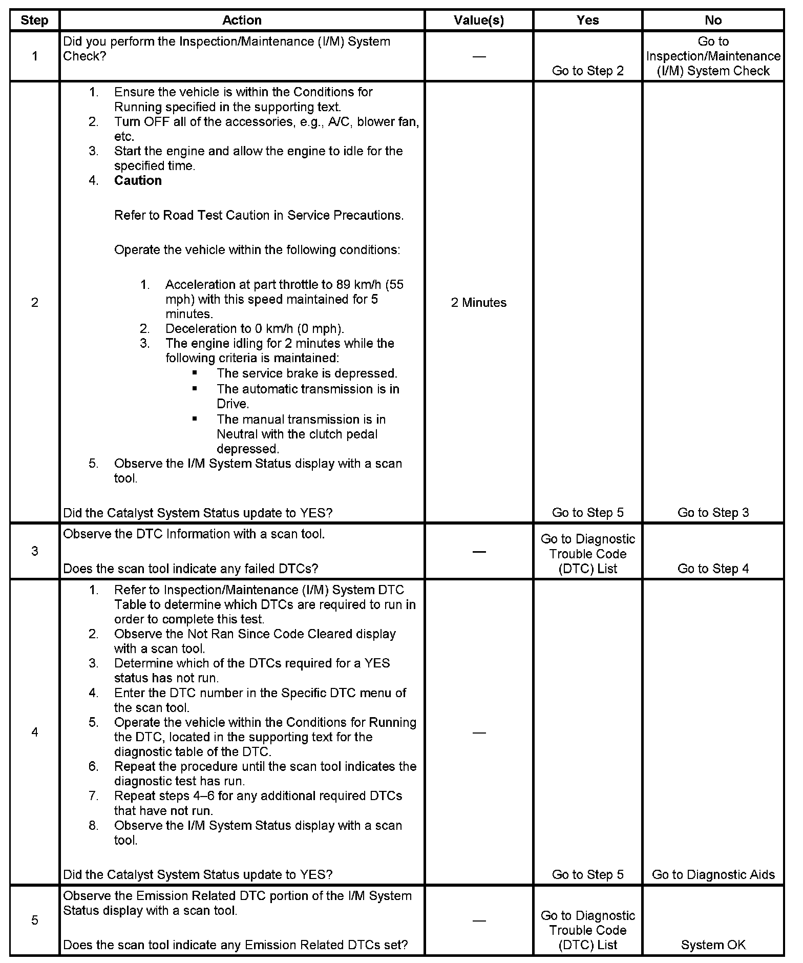 The purpose of this test is to satisfy the enable criteria necessary to execute I/M readiness diagnostics for the catalyst system. The test may be used to set the I/M System Status indicators to YES. Ensure the vehicle meets the requirements listed in Conditions for Running before performing this test. Failure to meet the necessary requirements may produce inaccurate test results.
