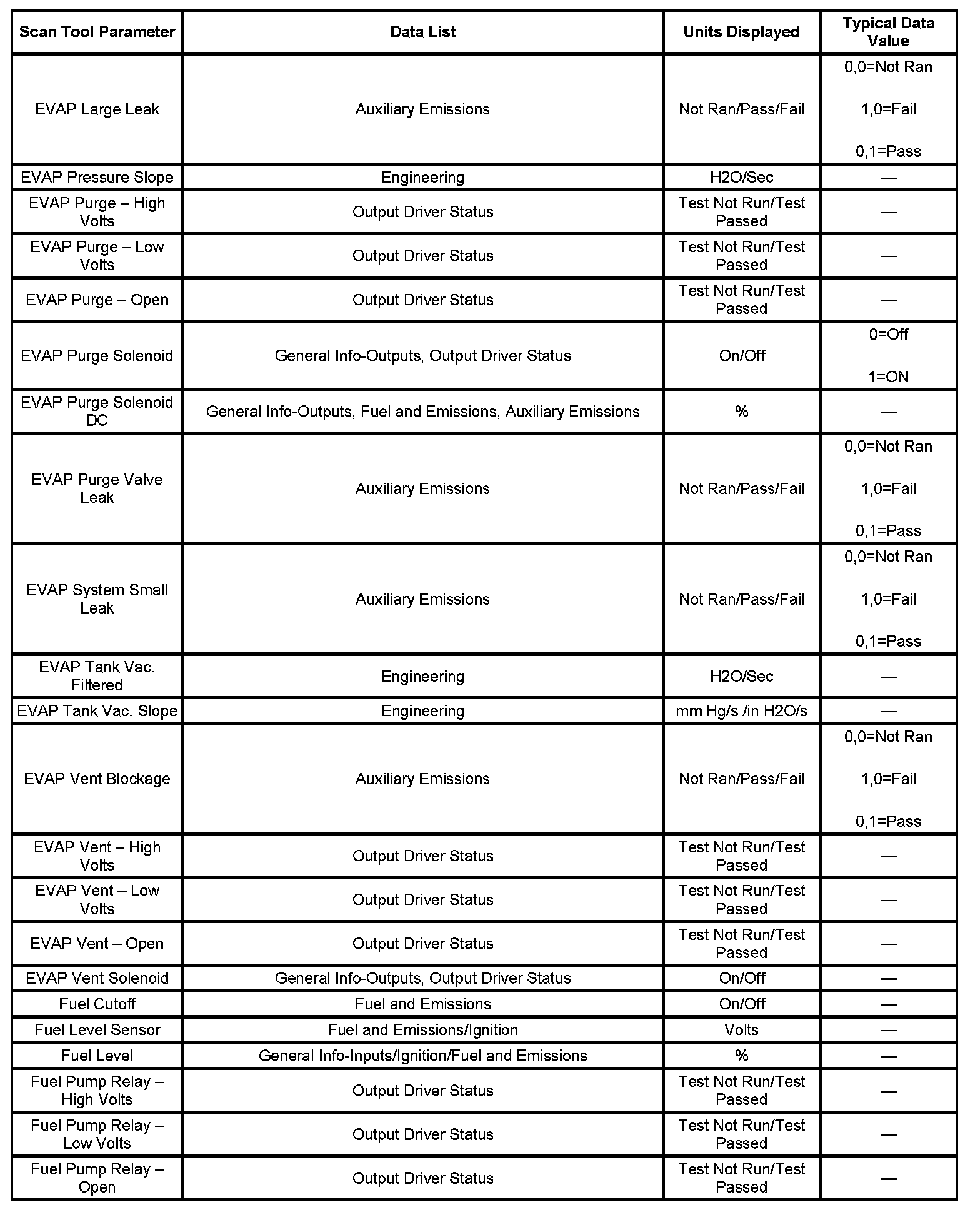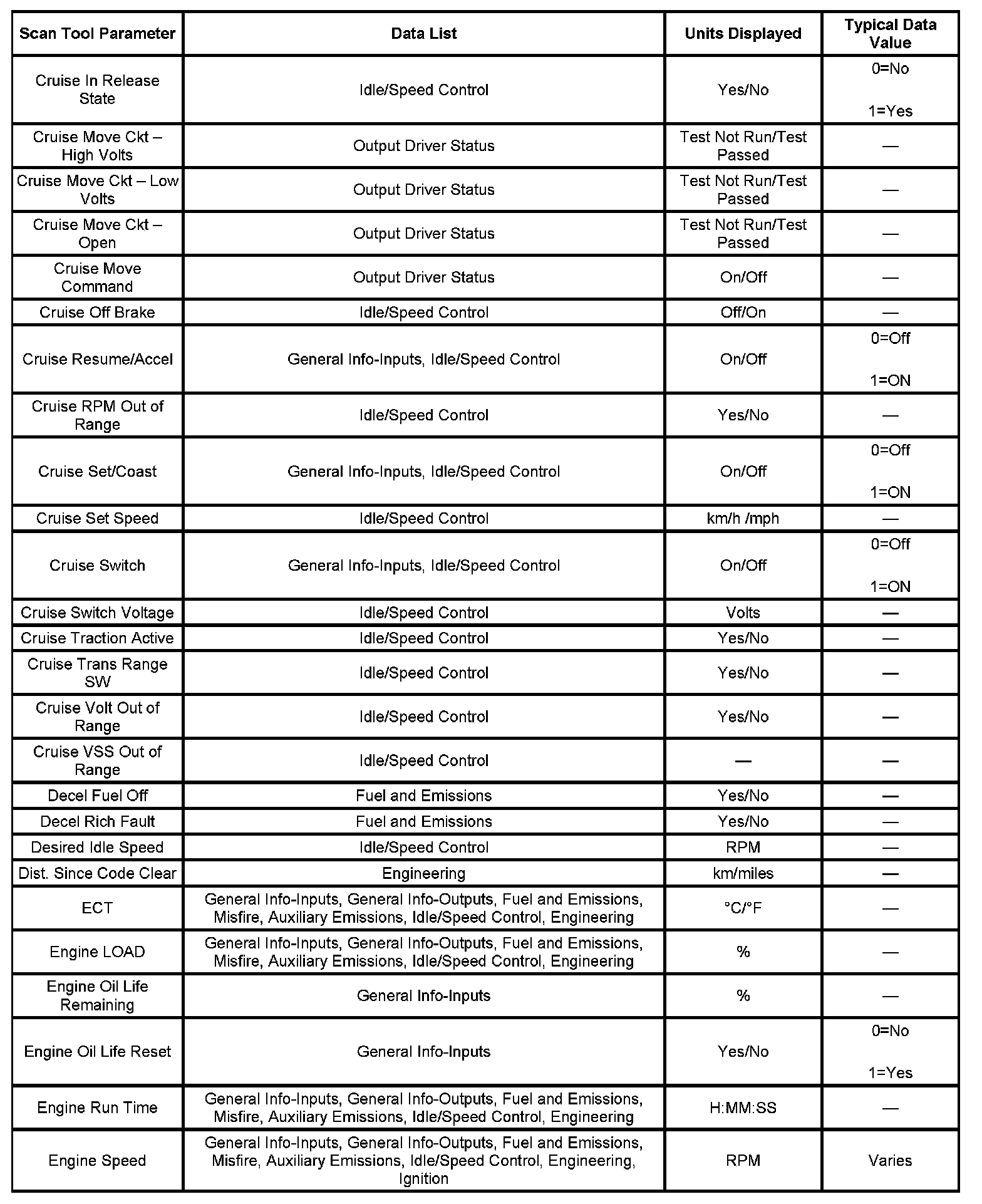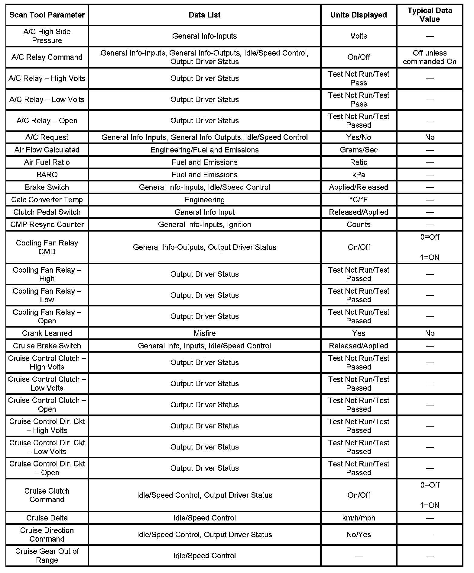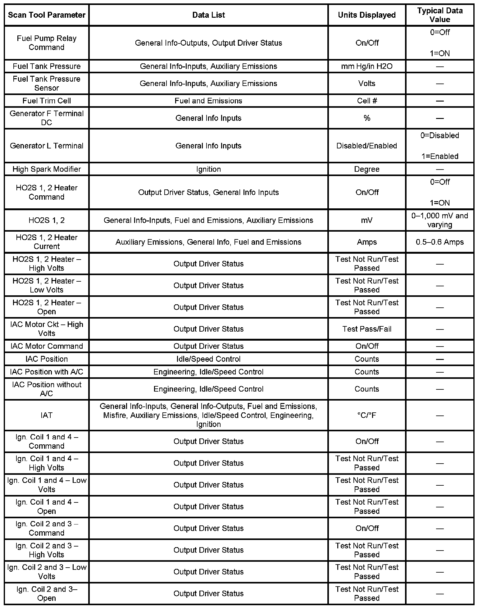 The engine Scan Tool Data List contains all engine related parameters that are available on the scan tool. The list is arranged in alphabetical order. The parameters in the Typical Scan Data values column represent values that would be seen on a normally running engine.