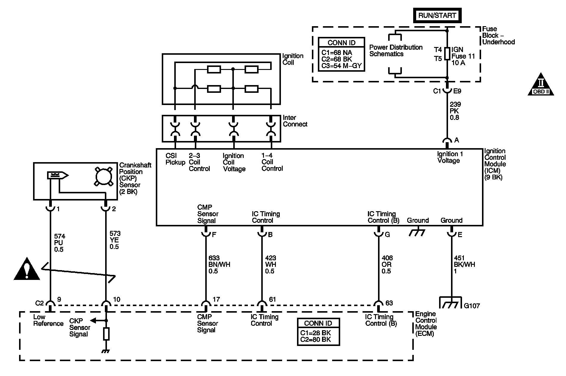 Each ignition coil supplies secondary voltage to a pair of spark plugs. This is called a waste spark ignition system. The engine control module (ECM) supplies ignition control (IC) signals to the ignition control module (ICM). The ICM fires the correct ignition coil at the correct time based on the IC signals. The ICM detects if cylinder 1 or cylinder 3 is on the compression stroke by sensing the secondary voltage and polarity of each side of the ignition coil. The higher voltage is on the compressing cylinder. The ICM provides a synthesized cam signal to the ECM based on these inputs. This is called compression sense ignition. The ECM uses the cam signals to synchronize fuel injection. This system consists of the following circuits: