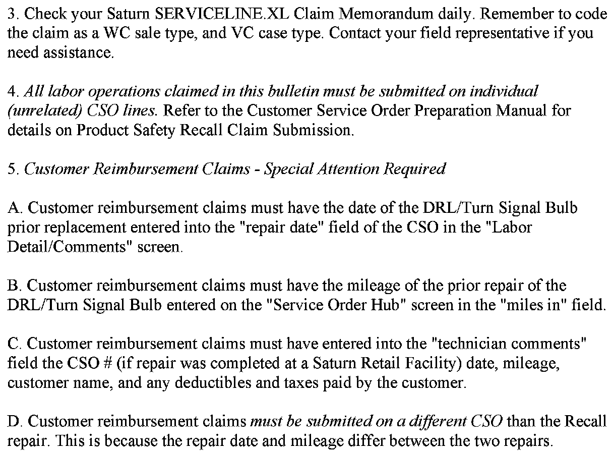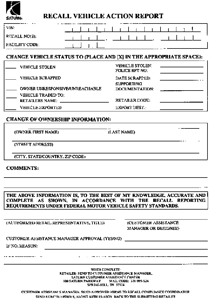 ^ Submit a Recall Vehicle Action Report to your Customer Assistance Manager (CAM) at the Saturn Customer Assistance Center. - OR