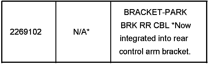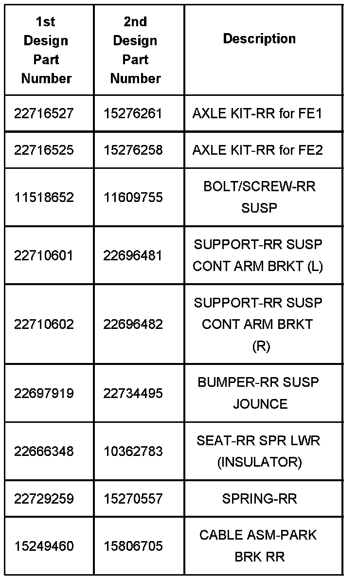 Once first design parts are exhausted, you must order the second design axle assembly kit (P/N 15276261 for FE1 or P/N 15276258 for FE2). You must also order the second design rear suspension jounce bumper, rear lower spring seat, and rear spring. The second design rear suspension control arm support brackets will be used to back service the first design rear suspension control arm support brackets and park brake cable bracket. When you order these kits, you must also order the rear suspension bolt/screw (P/N 11609755) to attach the rear axle assembly to the body. You must also use a second design park brake cable.