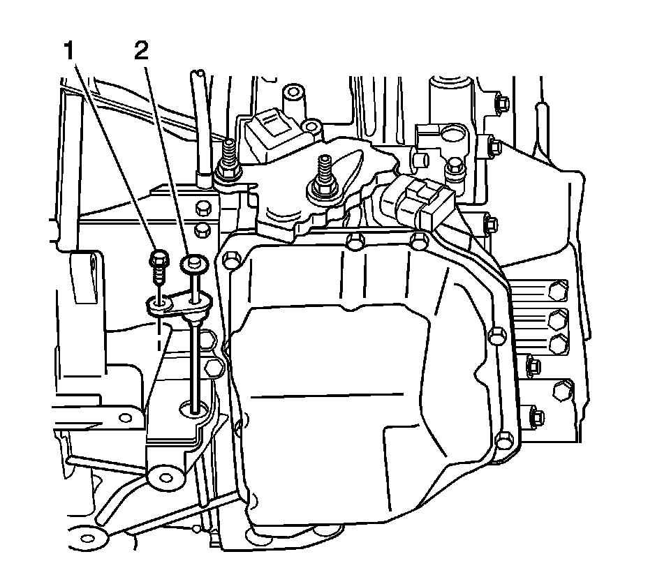 8. Remove the transmission level gage bolt (1) and gage (2).