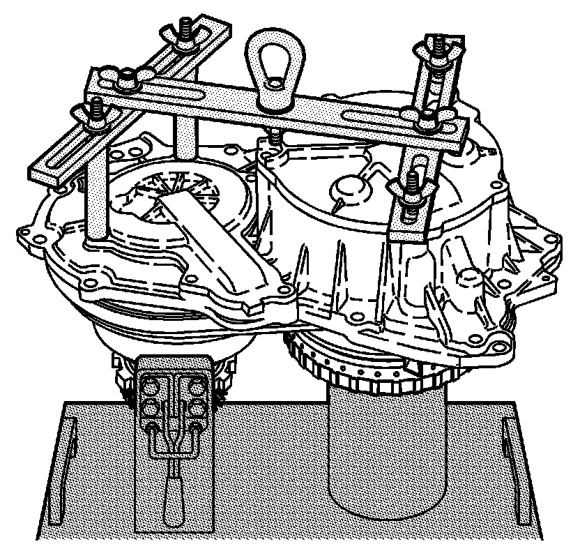 Using a suitable lifting device, carefully lift the case cover assembly - with forward clutch and input shaft - out of the J44337 and lower into the transmission case assembly.