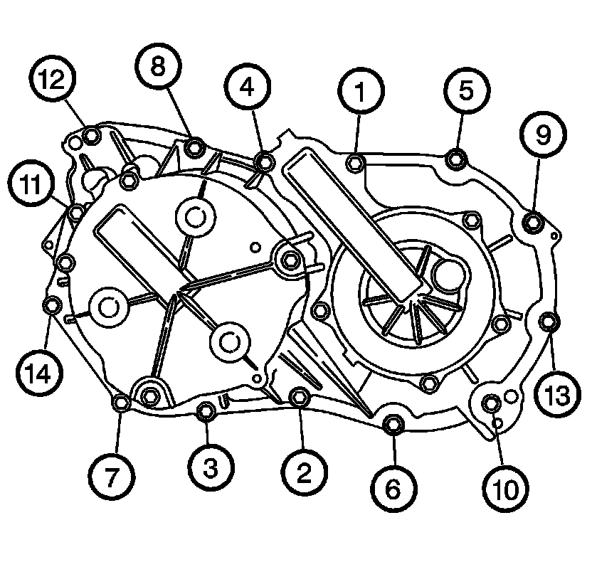 Important: Two of the 14 case cover bolts are longer than the other bolts. These two bolts are used for the driven pulley cover.