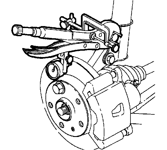 2. Fasten a dial indicator to steering knuckle so that the indicator plunger contacts the rotor about 10 mm (0.40 inch) from the rotor edge.